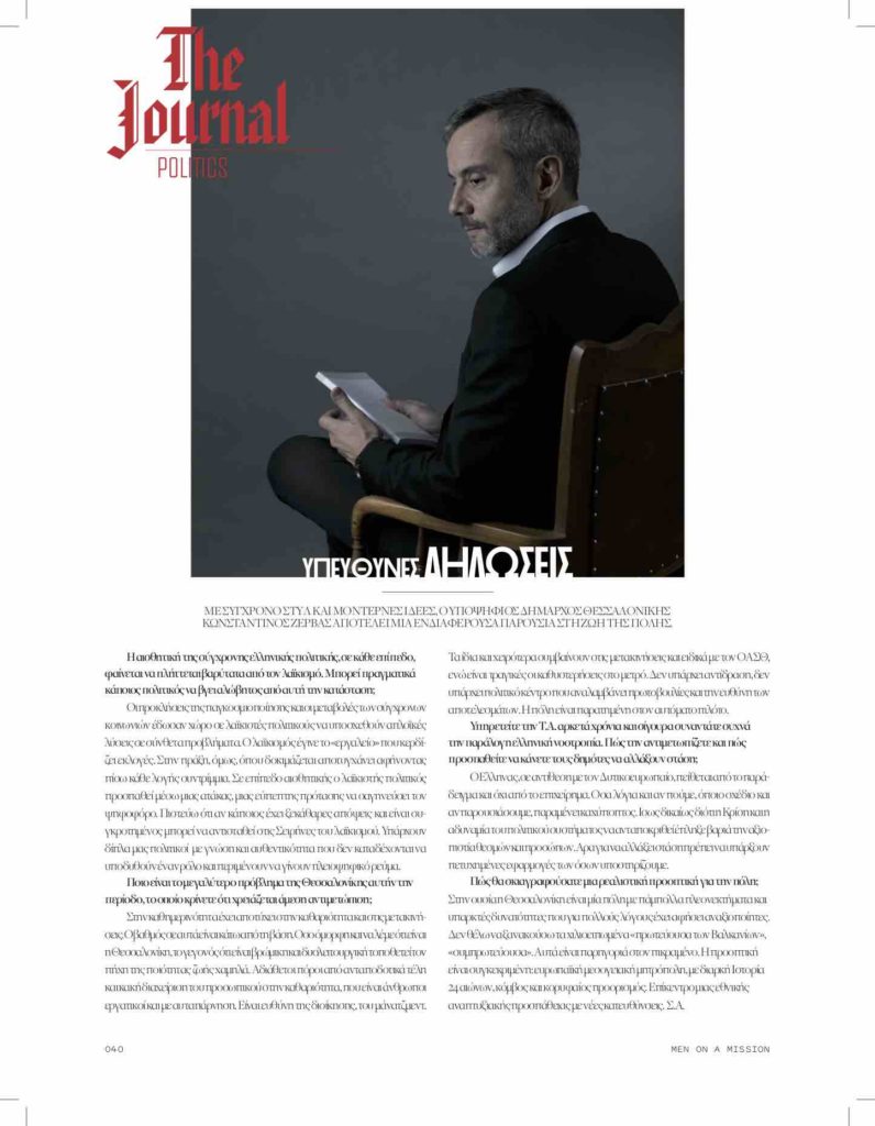 Στην ουσία η Θεσσαλονίκη είναι μία πόλη με πάμπολλα πλεονεκτήματα και υπαρκτές δυνατότητες που για πολλούς λόγους έχει αφήσει αναξιοποίητες. Δεν θέλω να ξανακούσω τα χιλιοειπωμένα «πρωτεύουσα των Βαλκανίων», «συμπρωτεύουσα». Αυτά είναι παρηγοριά στον πικραμένο. Η προοπτική είναι συγκεκριμένη: ευρωπαϊκή μεσογειακή μητρόπολη, με διαρκή ιστορία 24 αιώνων, κόμβος και κορυφαίος προορισμός. Επίκεντρο μιας εθνικής αναπτυξιακής προσπάθειας με νέες κατευθύνσεις.