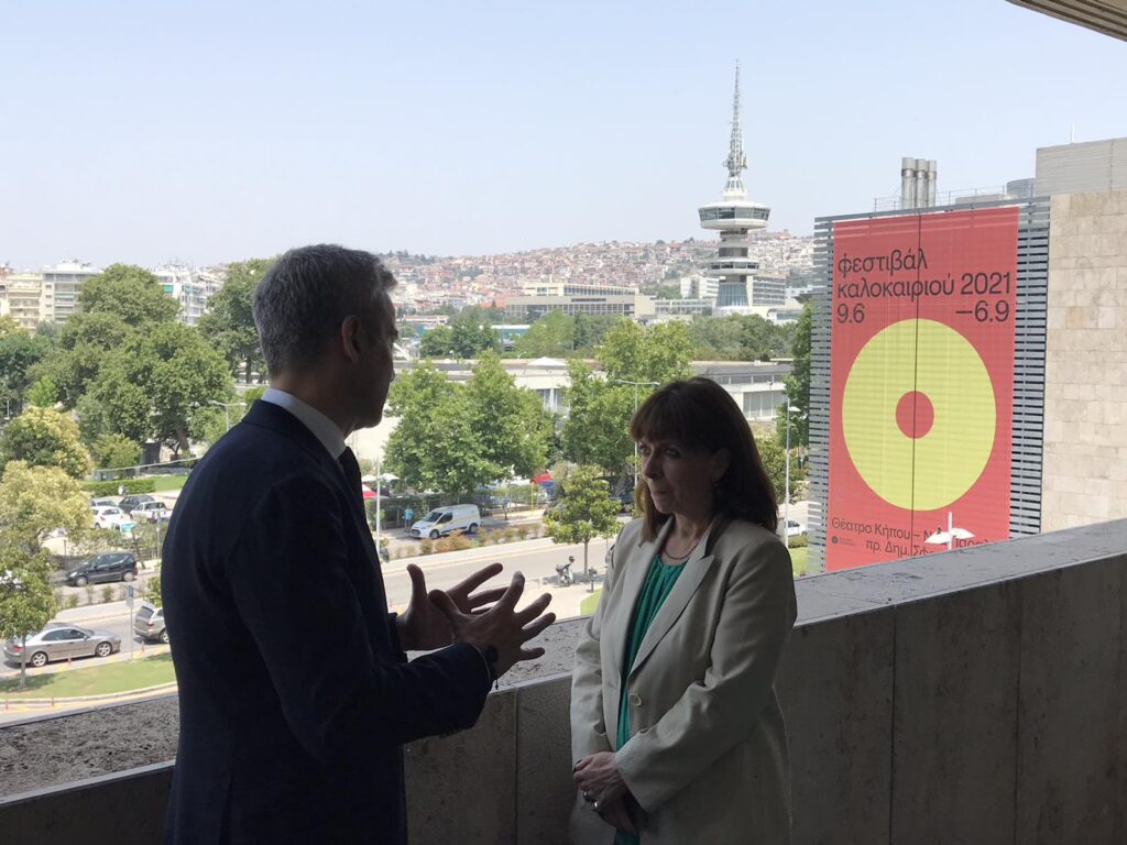 Ο Δήμαρχος Θεσσαλονίκης ξενάγησε την Πρόεδρο της Δημοκρατίας στη φωτογραφική έκθεση για τη “Συνοικία των Εξοχών”, που φιλοξενείται στο φουαγιέ του Δημαρχείου, ενώ συνέχεια ο κ. Ζέρβας και η κυρία Σακελλαροπούλου είχαν κατ’ ιδίαν συνάντηση.