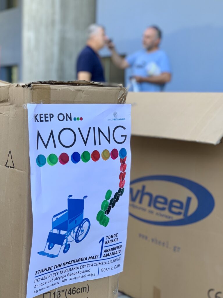 Τέσσερα αναπηρικά αμαξίδια σε φορείς από τον χώρο της υγείας διατέθηκαν σήμερα από τον Δήμο Θεσσαλονίκης, παρουσία του Δημάρχου Κωνσταντίνου Ζέρβα. Η προμήθεια των αμαξιδίων έγινε μέσω της συλλογής πλαστικών καπακιών, στο πλαίσιο της δράσης «Keep on Moving».