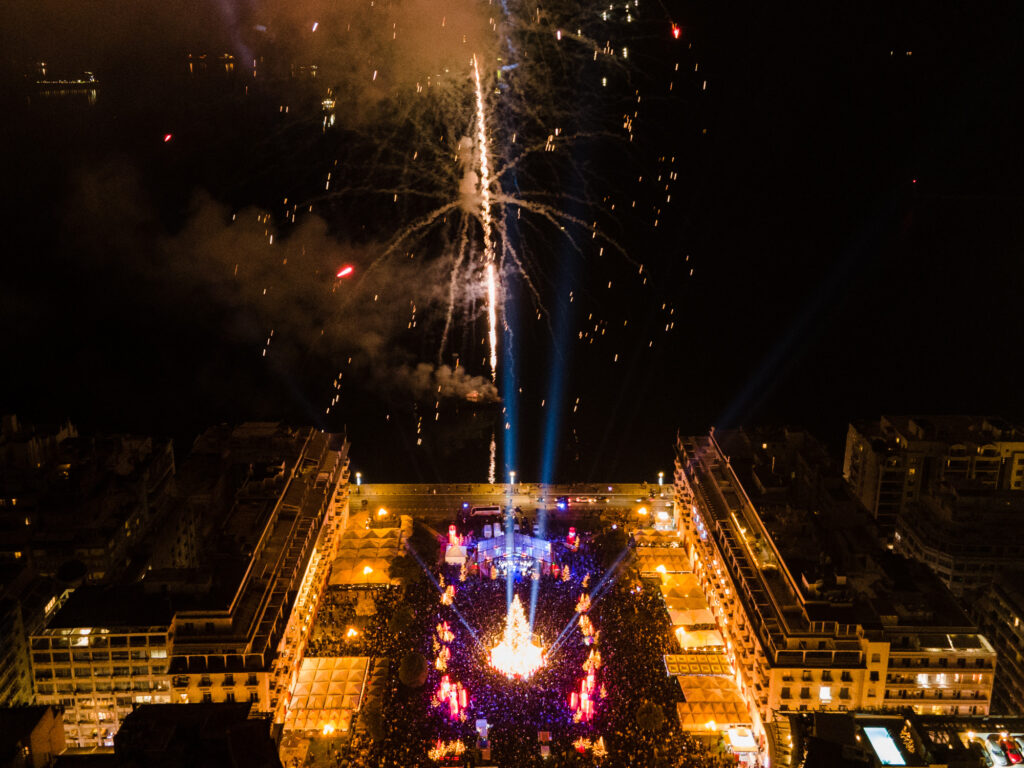 Τη στιγμή που ο Δήμαρχος Θεσσαλονίκης άναψε το χριστουγεννιάτικο δέντρο στην πλατεία Αριστοτέλους ξεκίνησε ένα εντυπωσιακό σόου πυροτεχνημάτων, διάρκειας πέντε λεπτών, που φώτισε τον ουρανό της Θεσσαλονίκης.