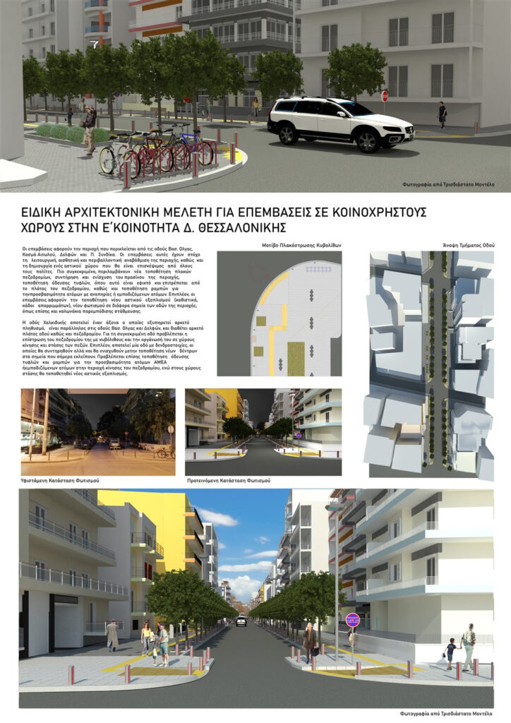 Σημείο αναφοράς αυτής της πρώτης παρέμβασης στην Ε΄ Δημοτική Κοινότητα θα αποτελέσει η οδός Χαλκιδικής, άξονας παράλληλος προς τις Βασιλίσσης Όλγας και Δελφών, που εξυπηρετεί αρκετό πληθυσμό. Τα πεζοδρόμια της συγκεκριμένης οδού θα επιστρωθούν με κυβόλιθους και θα οργανωθούν σε χώρους κίνησης και στάσης των πεζών. Οι δενδροστοιχίες της οδού Χαλκιδικής θα συντηρηθούν αλλά και θα ενισχυθούν με την τοποθέτηση νέων δέντρων. Ακόμη, θα διαμορφωθούν ζώνη όδευσης τυφλών και ράμπες, ενώ στους χώρους στάσης θα τοποθετηθεί νέος αστικός εξοπλισμός.