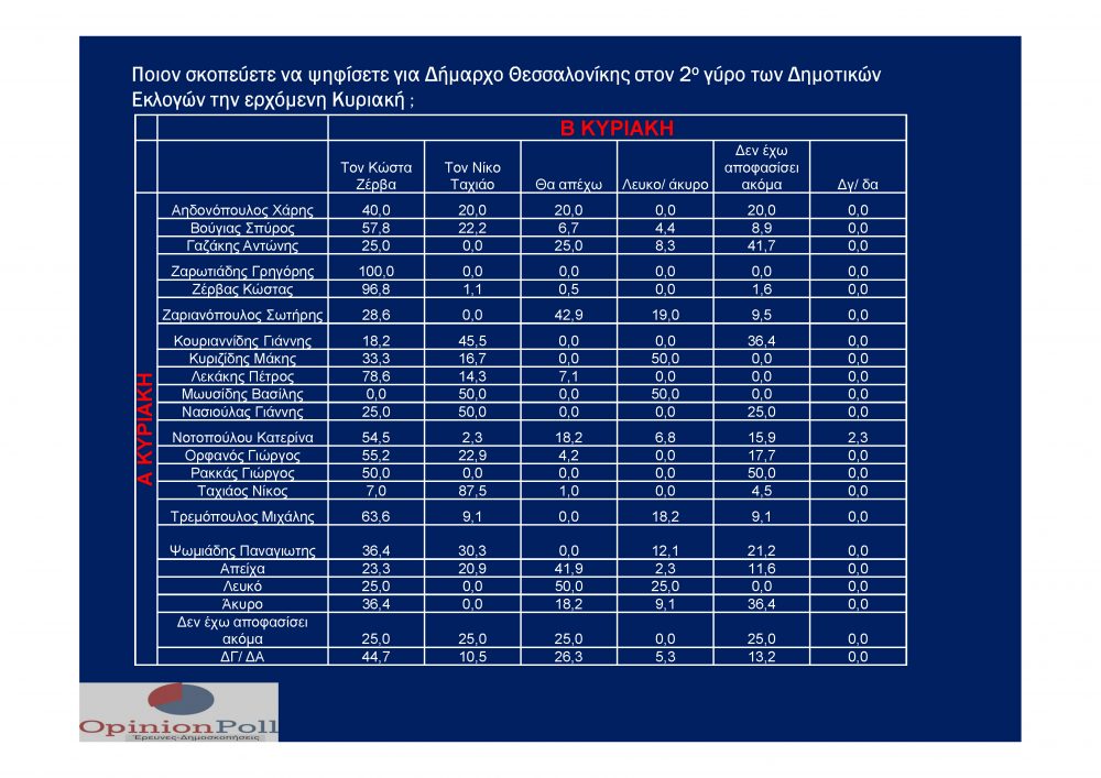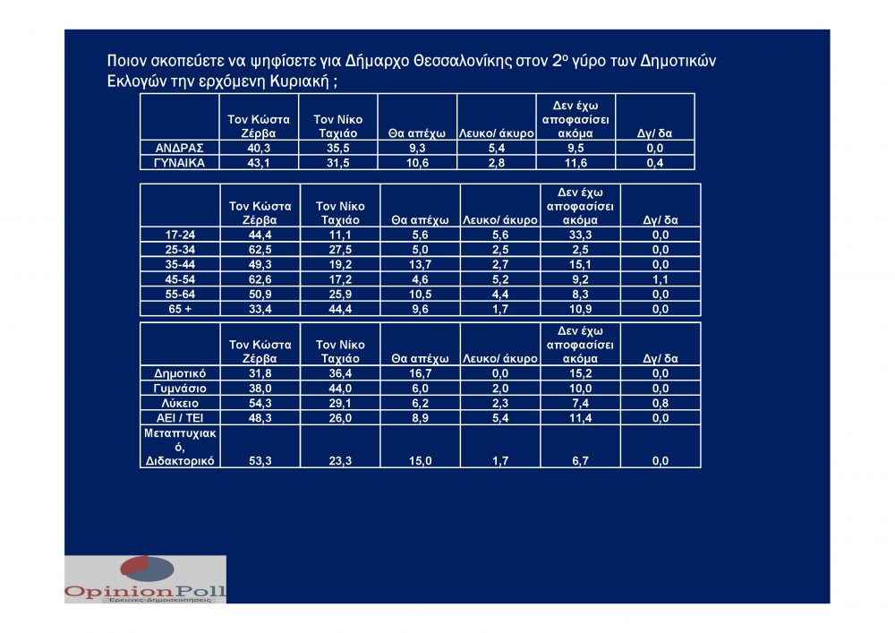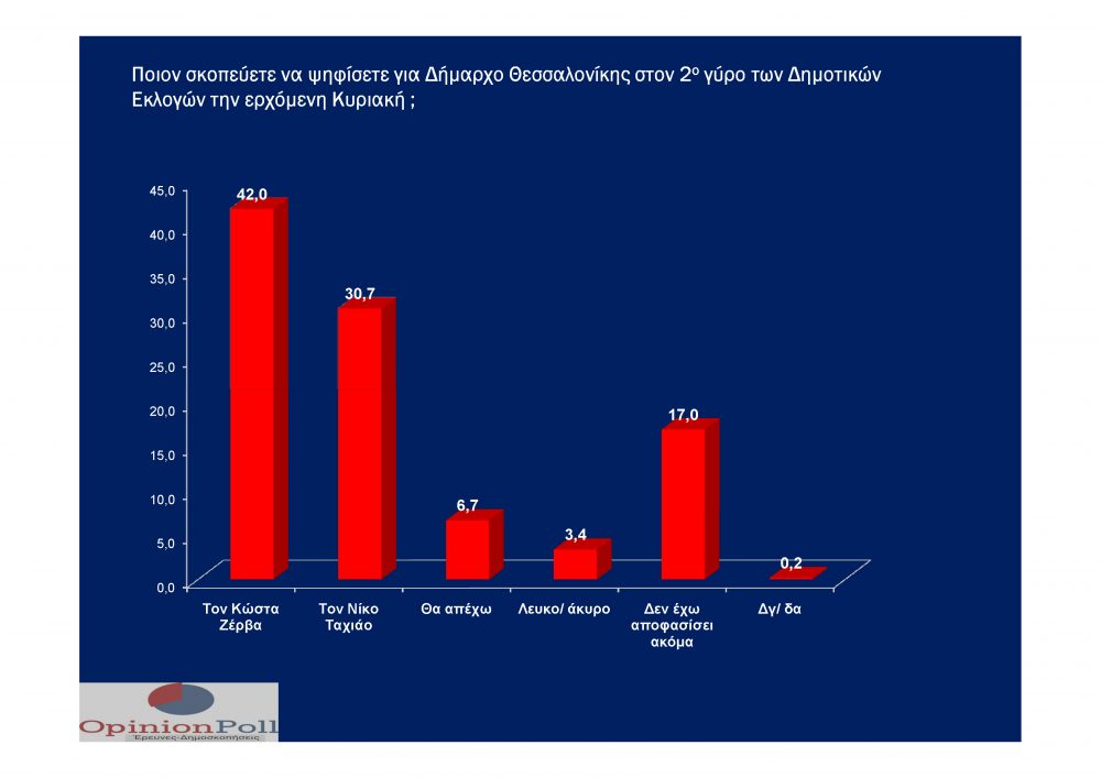 Με μεγάλη διαφορά  να προηγείται στον δεύτερο γύρο των Δημοτικών Εκλογών στον Δήμο Θεσσαλονίκης τον Κώστα Ζέρβα δείχνει η έρευνα της γνωστής Εταιρείας Δημοσκοπήσεων OPINION POLL που πραγματοποιήθηκε γα λογαριασμό της Free Press  Κarfitsa. Στην πρόθεση ψήφου ο Κώστας Ζέρβας κάνει ένα άλμα και φτάνει το 42%, έναντι του Νίκου Ταχιάου που φτάνει το 30,7 %, με το 6.7% να δηλώνει αποχή και ένα 7% να δηλώνει ότι δεν έχει αποφασίσει ακόμα.
