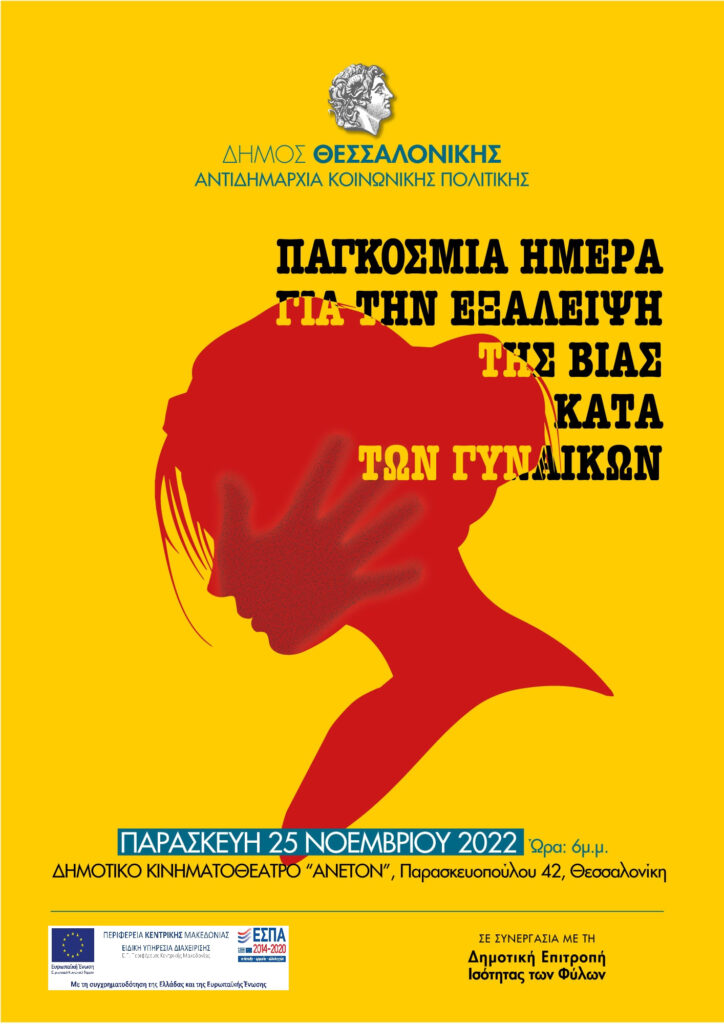 Εκδήλωση με αφορμή την Παγκόσμια Ημέρα για την Εξάλειψη της Βίας κατά των γυναικών οργανώνουν ο Δήμος Θεσσαλονίκης και το Τμήμα Κοινωνικής Πολιτικής και Ισότητας των Φύλων της Διεύθυνσης Κοινωνικής Προστασίας και Δημόσιας Υγείας την Παρασκευή 25 Νοεμβρίου 2022, στις 18:00, στο Δημοτικό Κινηματοθέατρο «ΑΝΕΤΟΝ».