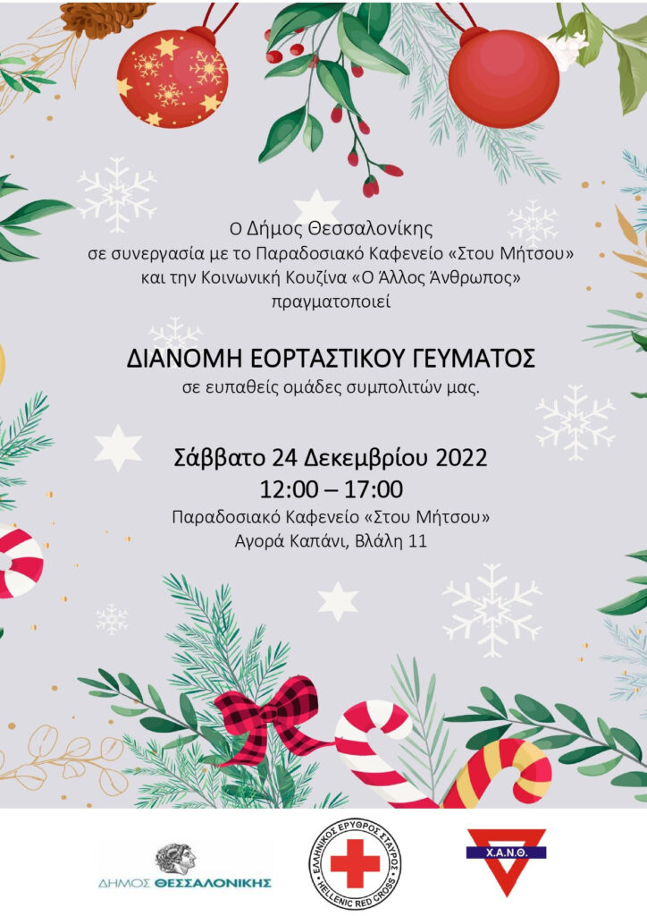 Ο Δήμος Θεσσαλονίκης σε συνεργασία με το παραδοσιακό Καφενείο «Στου Μήτσου» και την Κοινωνική Κουζίνα «Ο Άλλος Άνθρωπος» πραγματοποιεί δράση μαγειρέματος. Περίπου 1000 μερίδες φαγητού θα διανεμηθούν σε ευπαθείς ομάδες πολιτών ενώ από τις 14:00 έως τις 17:00 θα στηθεί στον υπαίθριο χώρο Βλάλη με Κυδωνιάτου στην Αγορά Καπάνι εορταστικό τραπέζι.