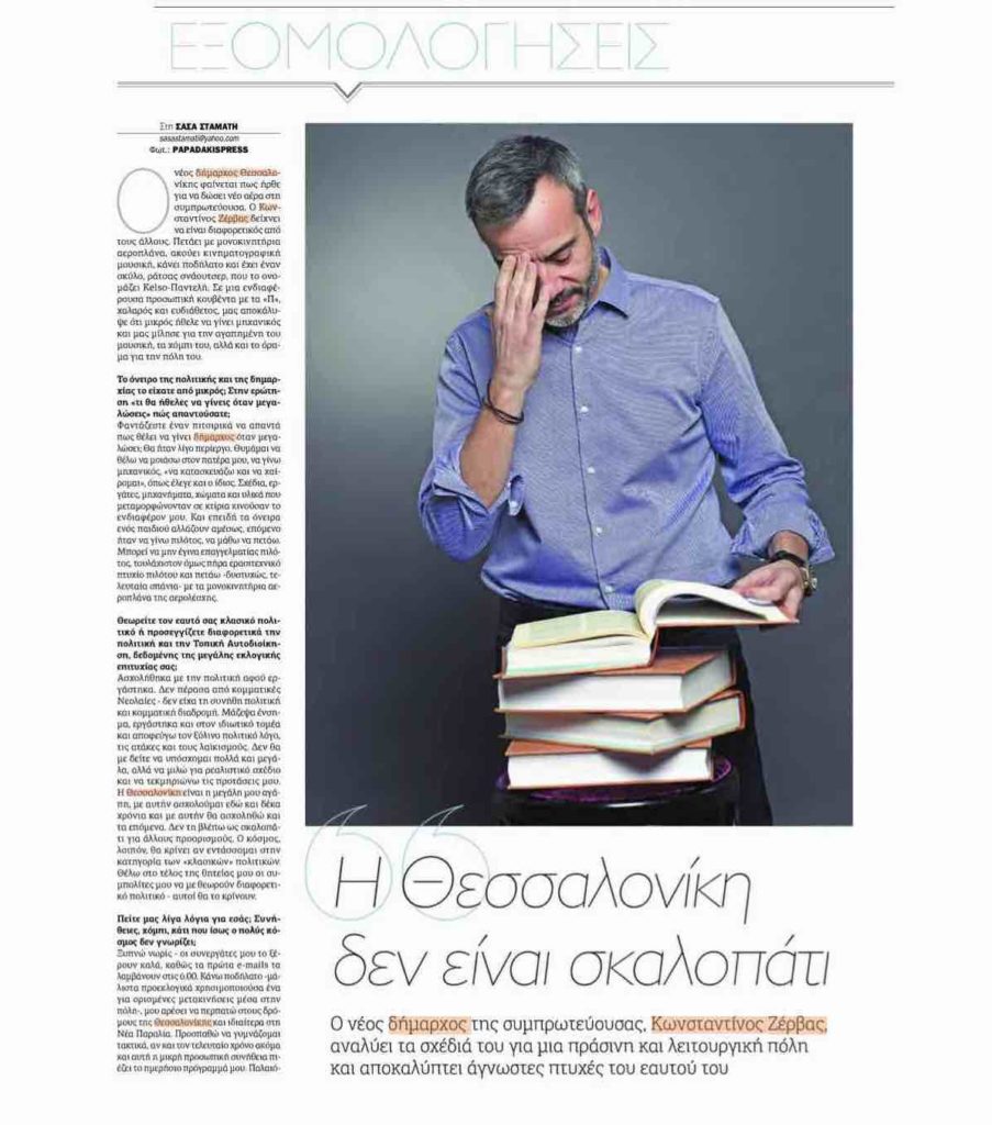 Ασχολήθηκα με την πολιτική αφού εργάστηκα. Δεν πέρασα από κομματικές Νεολαίες – δεν είχα τη συνήθη πολιτική και κομματική διαδρομή. Μάζεψα ένσημα, εργάστηκα και στον ιδιωτικό τομέα και αποφεύγω τον ξύλινο πολιτικό λόγο, τις ατάκες και τους λαϊκισμούς. Δεν θα με δείτε να υπόσχομαι πολλά και μεγάλα, αλλά να μιλώ για ρεαλιστικό σχέδιο και να τεκμηριώνω τις προτάσεις μου. Η Θεσσαλονίκη είναι η μεγάλη μου αγάπη, με αυτήν ασχολούμαι εδώ και δέκα χρόνια και με αυτήν θα ασχοληθώ και τα επόμενα. Δεν τη βλέπω ως σκαλοπάτι για άλλους προορισμούς. Ο κόσμος, λοιπόν, θα κρίνει αν εντάσσομαι στην κατηγορία των «κλασικών» πολιτικών. Θέλω στο τέλος της θητείας μου οι συμπολίτες μου να με θεωρούν διαφορετικό πολιτικό – αυτοί θα το κρίνουν.
