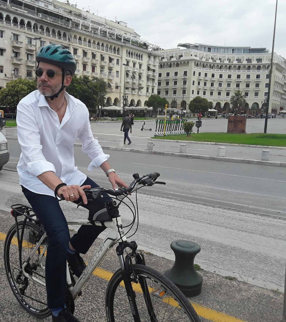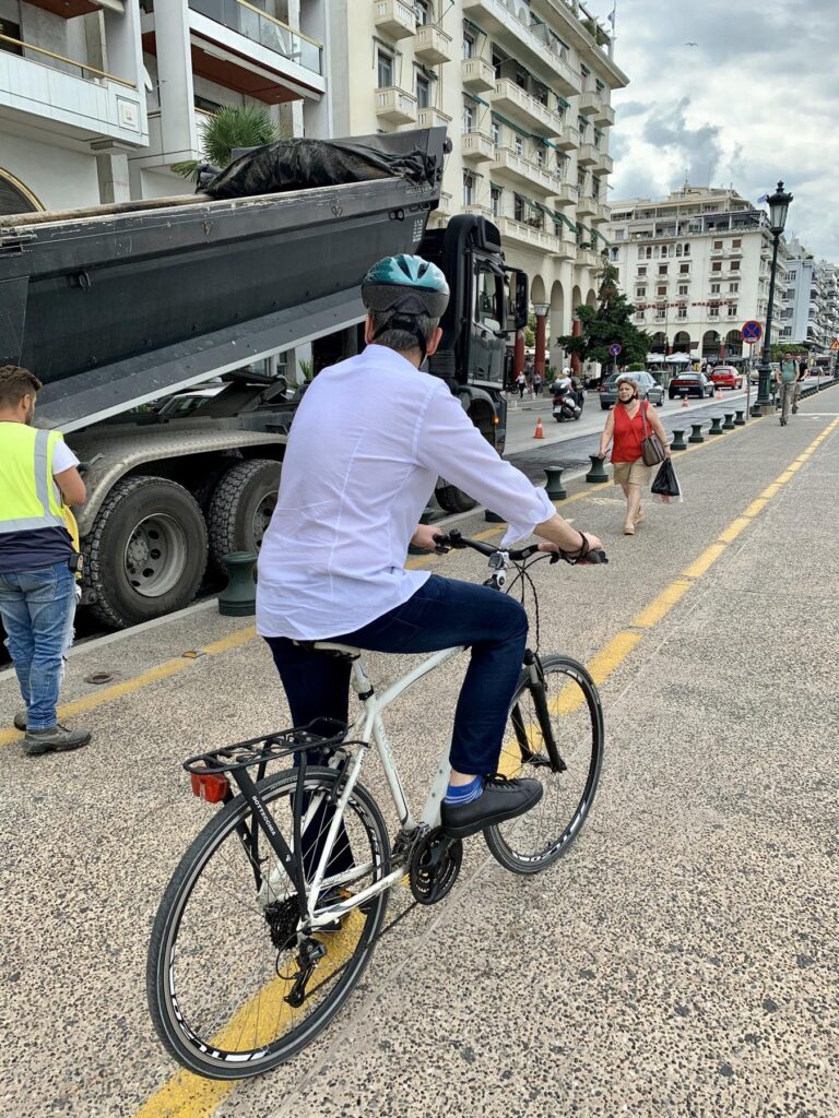 Με το ποδήλατό του έφτασε σήμερα το πρωί ο Δήμαρχος Θεσσαλονίκης Κωνσταντίνος Ζέρβας στη Λεωφόρο Νίκης, για να επιθεωρήσει τις εργασίες που βρίσκονται σε εξέλιξη για τη μεταφορά του ποδηλατόδρομου από το πλακόστρωτο της παλιάς παραλίας στο οδόστρωμα.