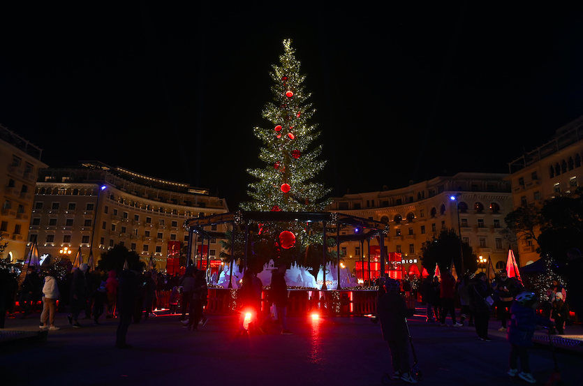 Την πλατεία και τον άξονα της Αριστοτέλους φωτίζουν φέτος περίπου 350.000 γιορτινά λαμπιόνια, χαμηλής ενεργειακής κατανάλωσης.
