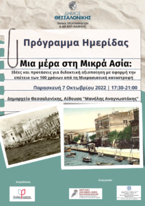 Το Τμήμα Προγραμμάτων & Δια Βίου Μάθησης της Διεύθυνσης Παιδείας του Δήμου Θεσσαλονίκης με αφορμή τα 100 χρόνια από τη Μικρασιατική καταστροφή διοργανώνει Ημερίδα την Παρασκευή 7 Οκτωβρίου (18:00-21:00) στην Αίθουσα Μανόλης Αναγνωστάκης, Δημαρχείο Θεσσαλονίκης με τίτλο: