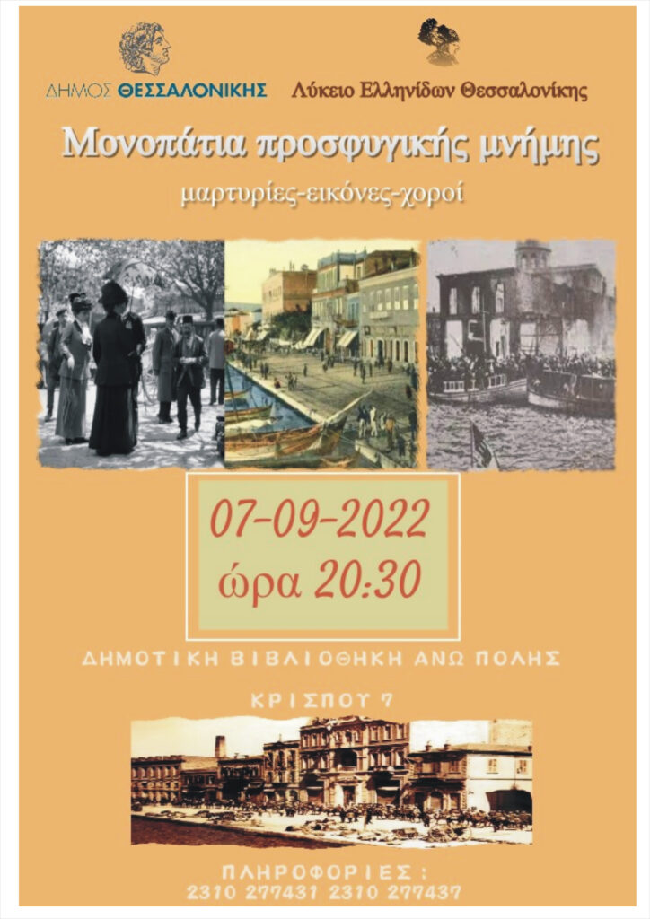 Ο Δήμος Θεσσαλονίκης, σε συνεργασία με το Λύκειο Ελληνίδων,  παρουσιάζει την Τετάρτη 7 Σεπτεμβρίου 2022, στις 20.30, στο αίθριο της Δημοτικής Βιβλιοθήκης Άνω Πόλης (Κρίσπου 7) εκδήλωση- αφιέρωμα στον προσφυγικό ελληνισμό, 100 χρόνια από τον οριστικό ξεριζωμό του  από τις πατρογονικές του εστίες σε Θράκη και Μικρά Ασία.