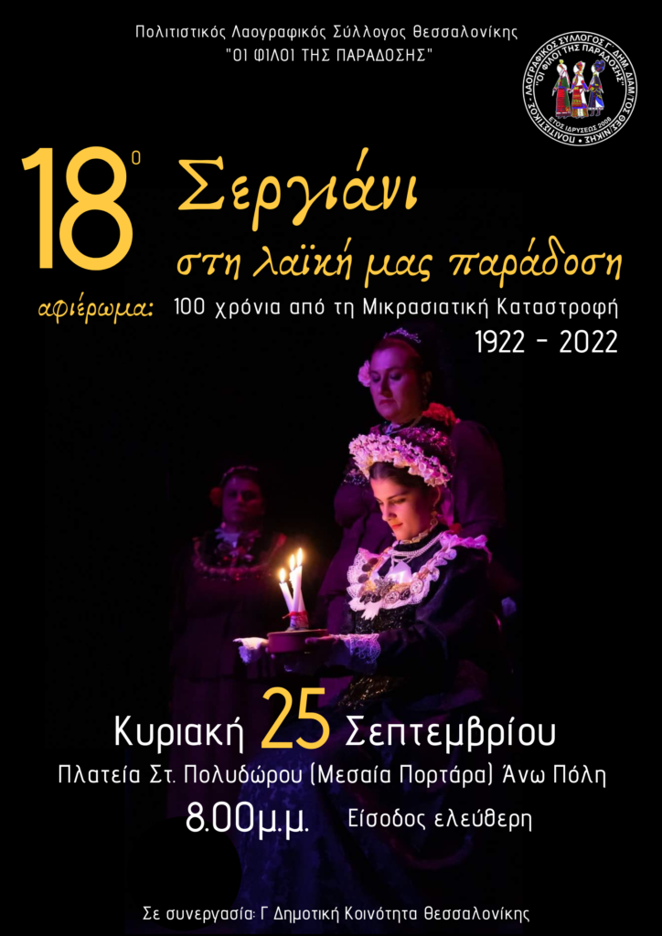 Μουσικοχορευτικό αφιέρωμα : «100 χρόνια από τη Μικρασιατική Καταστροφή 1922-2022» διοργανώνει η Γ΄ Δημοτική Κοινότητα του Δήμου Θεσσαλονίκης, με τίτλο “18ο Σεργιάνι στη Λαϊκή μας Παράδοση”, την Κυριακή 25 Σεπτεμβρίου 2022 στο Πάρκο Στεργίου Πολυδώρου Μεσαία Πορτάρα-Άνω Πόλη, με ώρα έναρξης 20:00.