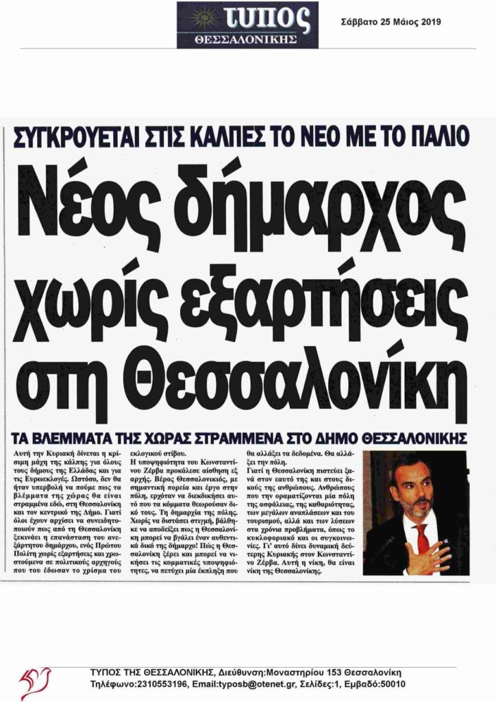 Γιατί η Θεσσαλονίκη πιστεύει ξανά στον εαυτό της και στους δικούς της ανθρώπους. Ανθρώπους που την οραματίζονται μία πόλη της ασφάλειας, της καθαριότητας, των μεγάλων αναπλάσεων και του τουρισμού, αλλά και των λύσεων στα χρόνια προβλήματα, όπως το κυκλοφοριακό και οι συγκοινωνίες. Γι’ αυτό δίνει δυναμική δεύτερης Κυριακής στον Κωνσταντίνο Ζέρβα. Αυτή η νίκη, θα είναι νίκη της Θεσσαλονίκης.