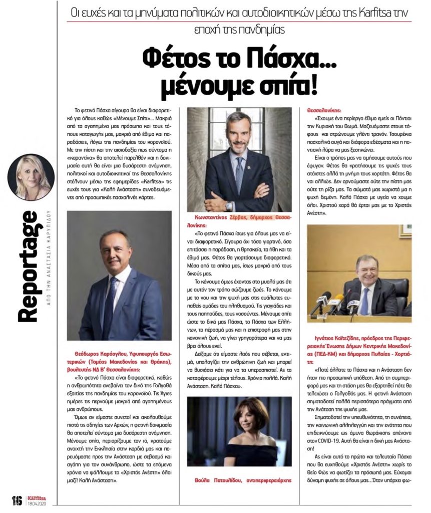 Οι ευχές και τα μηνύματα πολιτικών και αυτοδιοικητικών μέσω της Karfitsa την εποχή της πανδημίας. Φέτος το Πάσχα μένουμε σπίτι!