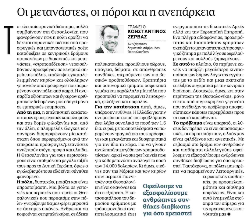 Το πρόβλημα είναι υπαρκτό, οι λύσεις δεν πρέπει να είναι αποσπασματικές, οι πόροι υπάρχουν, ο λαός µας είναι φιλόξενος και ανεκτικός. Με σεβασμό στο δράμα των ανθρώπων και αισθήματα αλληλεγγύης οφείλουμε να εξασφαλίσουμε ανθρώπινες συνθήκες διαβίωσης για όσο χρειαστεί. Ταυτόχρονα, οι πόλεις µας πρέπει να παραμείνουν λειτουργικές, ευρωπαϊκής αισθητικής, µε προσπελασιμότητα και αίσθημα ασφάλειας. Είναι και αυτό ένα μεγάλο στοίχημα του σήμερα για τις οργανωμένες κοινότητές μας.