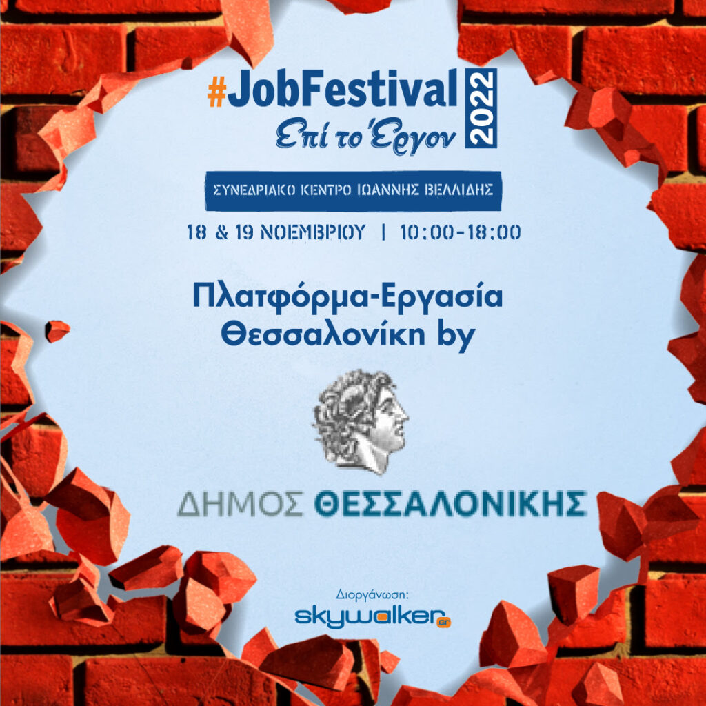 Ο Δήμος Θεσσαλονίκης συμμετέχει στο #JobFestival 2022 , που πραγματοποιείται στη Θεσσαλονίκη στις 18 & 19 Νοεμβρίου 2022 από το skywalker.gr στο Βελλίδειο Συνεδριακό Κέντρο παρουσιάζοντας την ιστοσελίδα «Πλατφόρμα Αναζήτησης Προσφοράς Εργασίας».