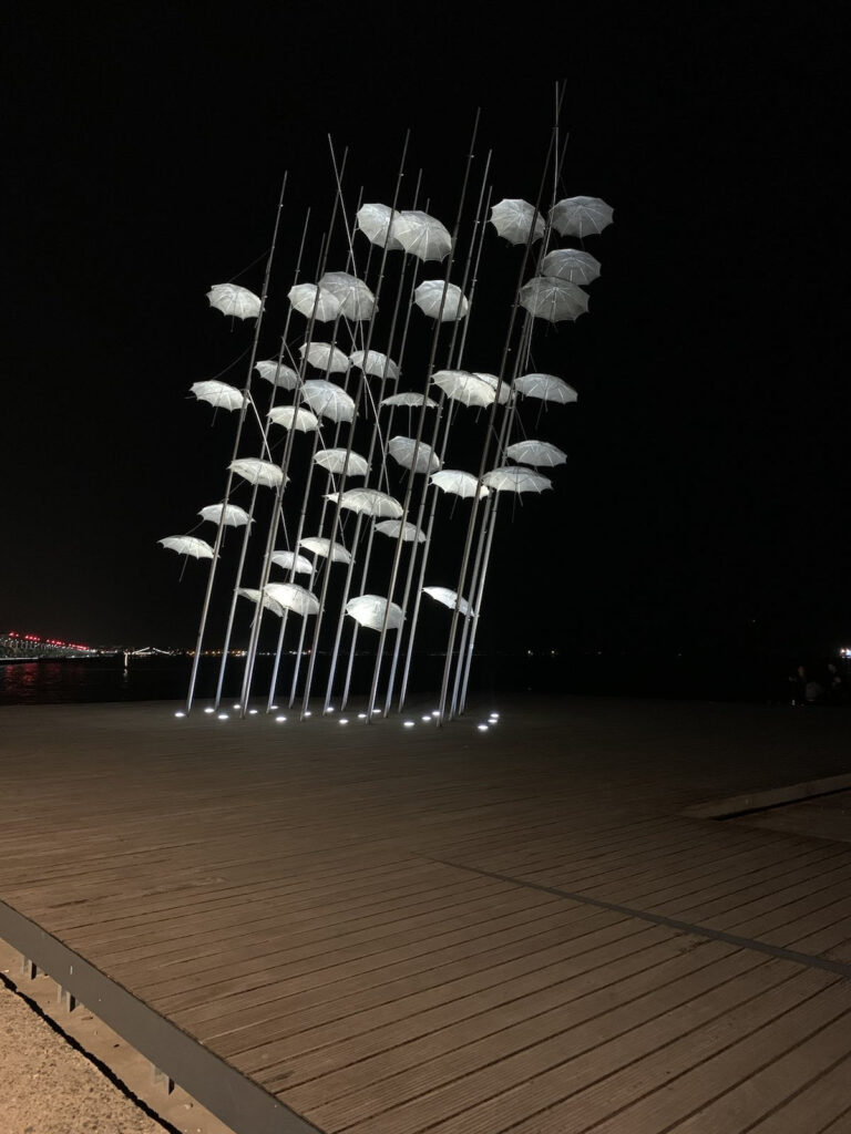 Σε λευκό χρώμα, ώστε να σηματοδοτούνται τα μηνύματα της Ανάστασης, φωτίστηκαν απόψε (Μεγάλο Σάββατο, 1 Μαΐου) οι “Ομπρέλες” του Ζογγολόπουλου, στη νέα παραλία της Θεσσαλονίκης.