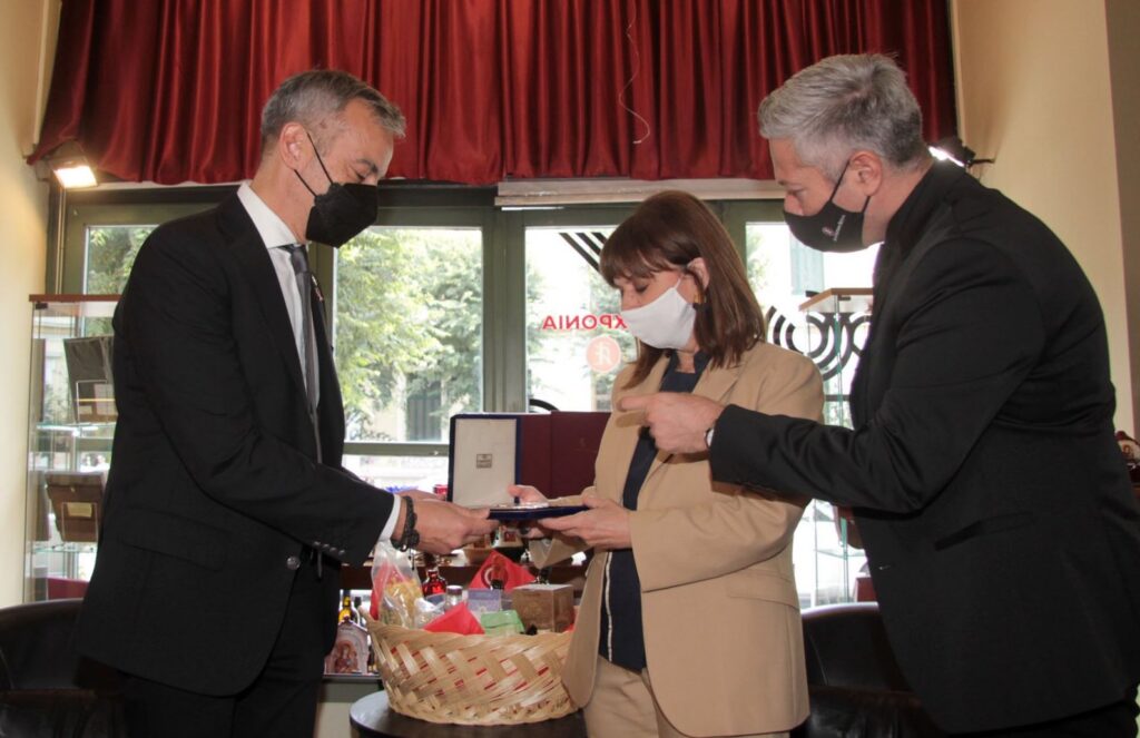Στο πλαίσιο της επίσκεψής της στην Αγιορειτική Εστία, ο κ. Ζέρβας προσέφερε στην Κατερίνα Σακελλαροπούλου ένα συλλεκτικό αναμνηστικό από την έκθεση “Θησαυροί του Αγίου Όρους”, που είχε παρουσιαστεί στη Θεσσαλονίκη με την ευκαιρία της Πολιτιστικής Πρωτεύουσας της Ευρώπης, καθώς κι ένα καλάθι με προϊόντα του Αγίου Όρους.