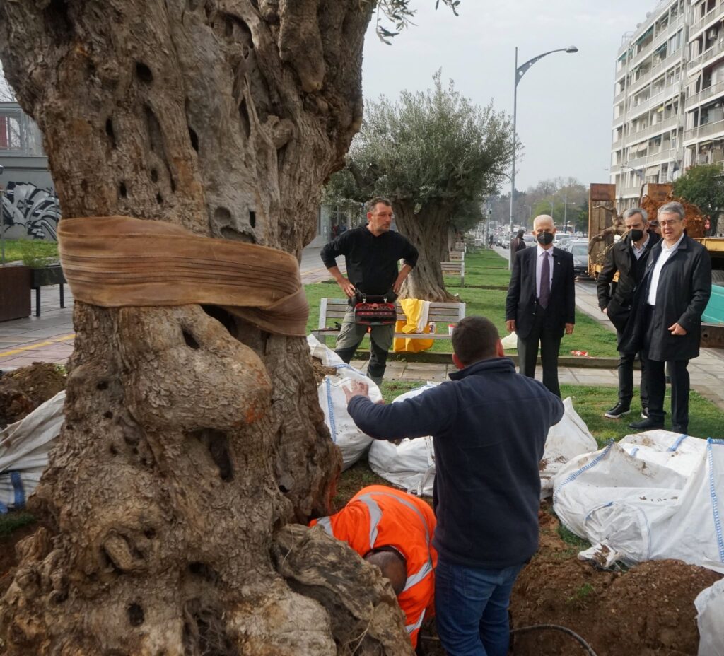Η αντικατάσταση των ελαιόδεντρων έγινε παρουσία του Δημάρχου Θεσσαλονίκης Κωνσταντίνου Ζέρβα και του επιχειρηματία Σταύρου Ανδρεάδη, με δωρεά του οποίου υλοποιήθηκε η συνολική παρέμβαση στον άξονα της Αγγελάκη. Παρόντες στη διαδικασία τοποθέτησης των νέων δέντρων ήταν ο Αντιδήμαρχος Περιβάλλοντος Ερωτόκριτος Θεοτοκάτος και ο Αντιδήμαρχος Κοινωνικής Πολιτικής Σωκράτης Δημητριάδης.