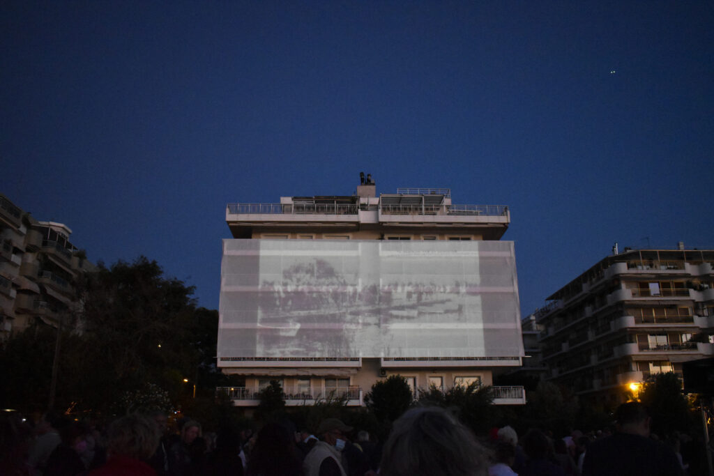 Για τις ανάγκες της επετειακής εκδήλωσης η πρόσοψη παρακείμενης πολυκατοικίας μετατράπηκε σε οθόνη κινηματογράφου, όπου προβλήθηκαν εικόνες από τα δραματικά γεγονότα που συνόδευσαν τη Μικρασιατική Καταστροφή.
