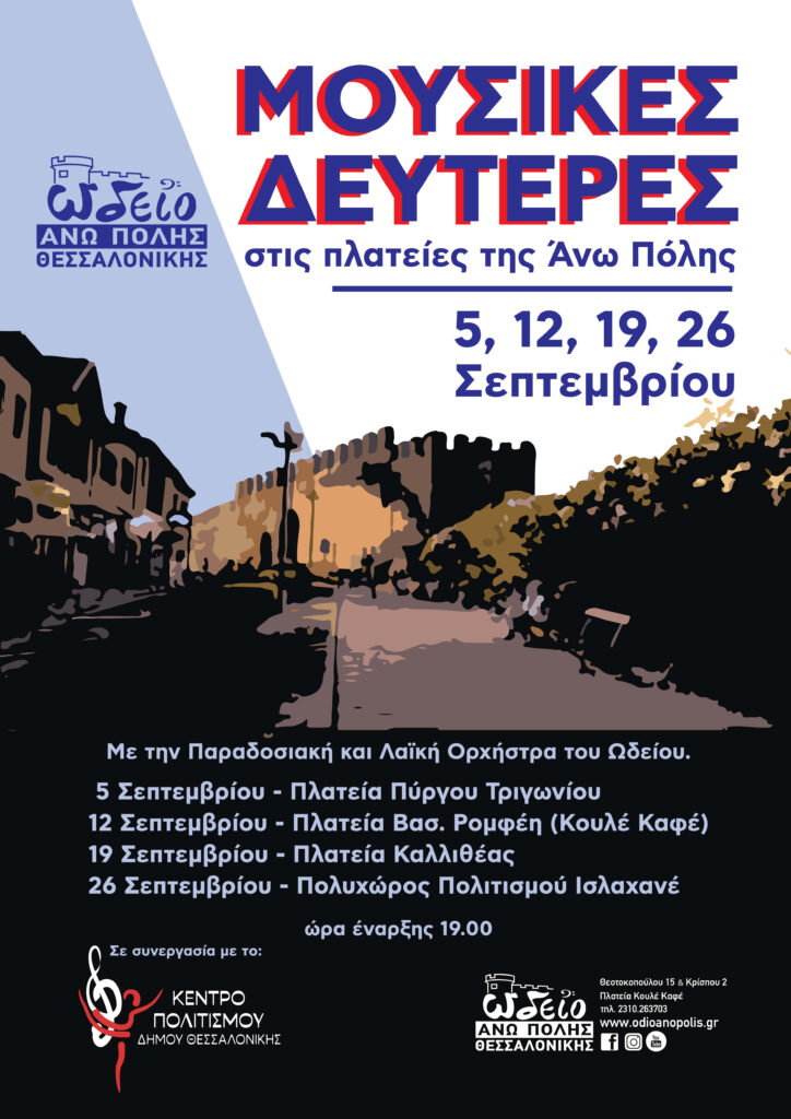 Την Δευτέρα 5 Σεπτεμβρίου 2022 στις 19.30  και κάθε Δευτέρα του Σεπτέμβρη, το Ωδείο Άνω Πόλης σε συνεργασία με το Κέντρο Πολιτισμού του Δήμου Θεσσαλονίκης,  εγκαινιάζει μια νέα σειρά υπαίθριων συναυλιών στις γραφικές πλατείες της Άνω Πόλης με ελεύθερη είσοδο για το κοινό.