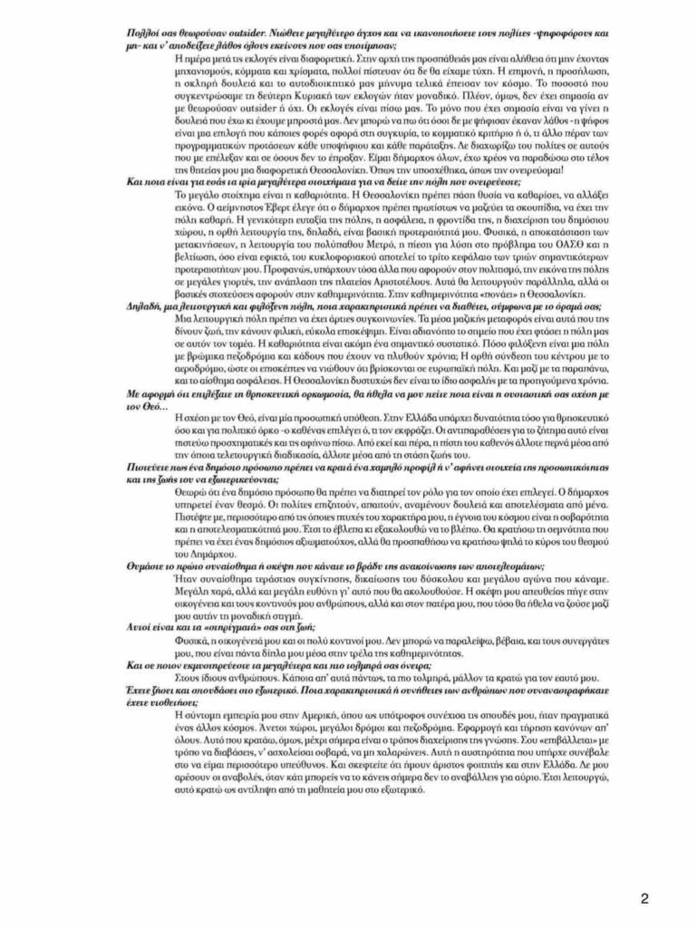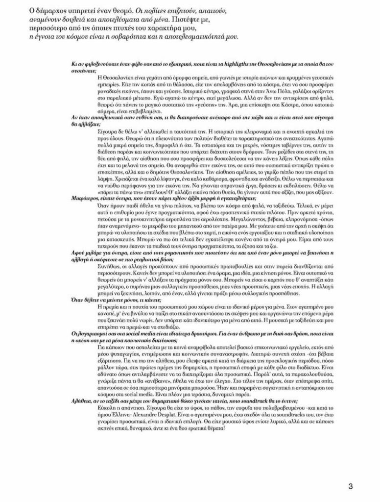 Σίγουρα δε θέλω ν’ αλλοιωθεί η ταυτότητά της. Η ιστορική της κληρονομιά και η ανοιχτή αγκαλιά της προς όλους. Θεωρώ ότι η πλειονότητα των πολιτών διαθέτει το χαρακτηριστικό της ανεκτικότητας. Αγαπώ πολλά μικρά σημεία της, δημοφιλή ή όχι. Τα εστιατόρια και τις μικρές, νόστιμες ταβέρνες της, αυτήν τη διάθεση παρέας και κοινωνικότητας που υπάρχει διάχυτη στους δρόμους. Τους μεζέδες στα στενά της, τη θέα από ψηλά, την αίσθηση που σου προσφέρει και δυσκολεύεσαι να την κάνεις λέξεις. Όπως κάθε πόλη έχει και τα μελανά της σημεία. Θα αναφερθώ στην εικόνα της, σε αυτό που ουσιαστικά αντικρίζει πρώτα ο επισκέπτης, αλλά και ο δημότης Θεσσαλονίκης. Την αίσθηση αμέλειας, το γκρίζο πέπλο που της στερεί τη λάμψη. Χρειάζεται ένα καλό λίφτινγκ, ένα καλό καθάρισμα, φροντίδα και ανάδειξη. Θέλω να περπατάω και να νιώθω περήφανος για την εικόνα της. Να γίνονται σημαντικά έργα, δράσεις κι εκδηλώσεις. Θέλω να «πάρει τα πάνω της» επιτέλους! Θ’ αλλάξει εικόνα πάση θυσία, θα γίνουν αυτά που αξίζει, που μας αξίζουν.