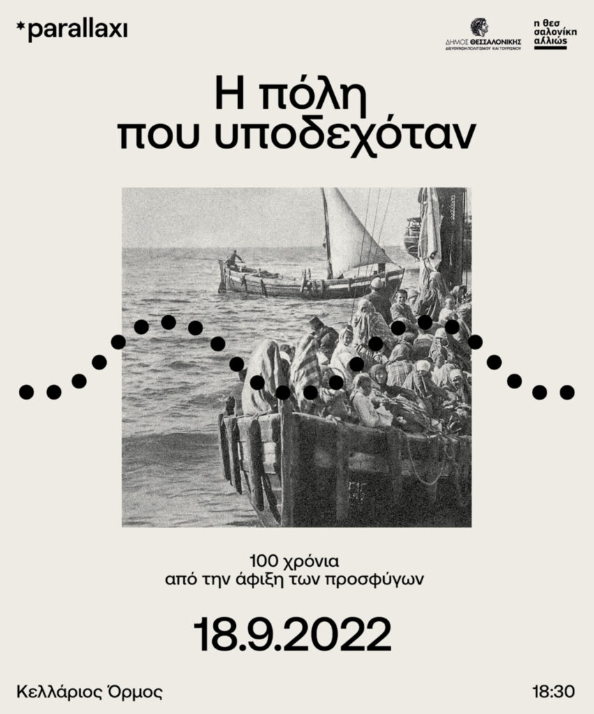 Ο Δήμος Θεσσαλονίκης, στο πλαίσιο των επετειακών εκδηλώσεων για τα 100 χρόνια από τη Μικρασιατική Καταστροφή, και το αστικό project «Η Θεσσαλονίκη Αλλιώς» της Parallaxi παρουσιάζουν το πολυθέαμα «Θεσσαλονίκη η πόλη που υποδεχόταν». Το πολυθέαμα, με αφορμή τα εκατό χρόνια από την άφιξη των προσφύγων της Μικρασιατικής Καταστροφής, θα παρουσιαστεί την Κυριακή 18/9/2022, στις 18:30 μ.μ., στον Κελλάριο Κόλπο.